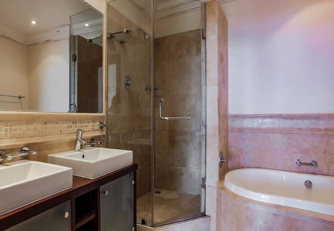 Both bedrooms are en-suite in this unit - both having double beds with an en-suite bathroom. The bathrooms have a shower and a bath. The main bedroom has double basins in the bathroom. The bedrooms are equipped with air-conditioning as well as ceiling fans. The living areas have ceilings fans and air con.
