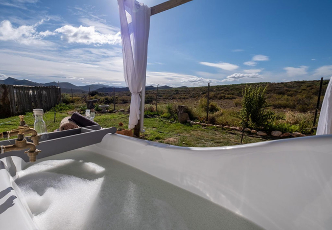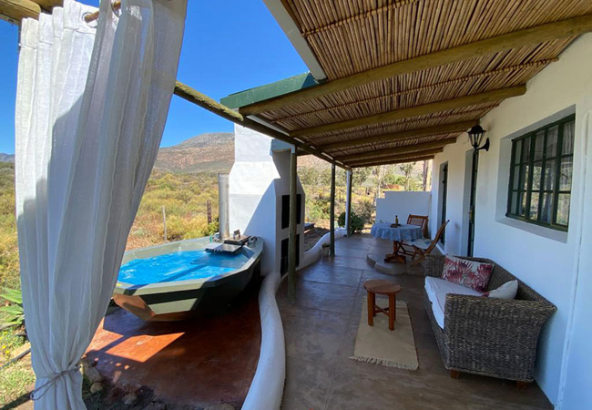 360 on 62 Pale Chanting Cottage in Montagu sleeps two guests in one bedroom. The bedroom is furnished with a double bed. The bathroom is fitted with a shower, toilet and basin. The kitchen has huge fireplace and is well equipped for your self catering stay. The outdoor patio boasts a built in braai, an outdoor bath-tub as well as a wood-fired hot tub from which to enjoy the peace, quiet and mountain views. Wood for the braai and hot-tub is provided at no extra charge. Pale Chanting and Fish Eagle stand back-to-back to each other and are ideal cottages for couples / families / friends travelling together. There is a communal braai facility shared by all the farm cottages at the swimming pool. The pool at 360 on 62 Farm Cottages overlooks the majestic Langeberg Mountains and is a great setting for a sundowner or for simply lazing around on a hot day.