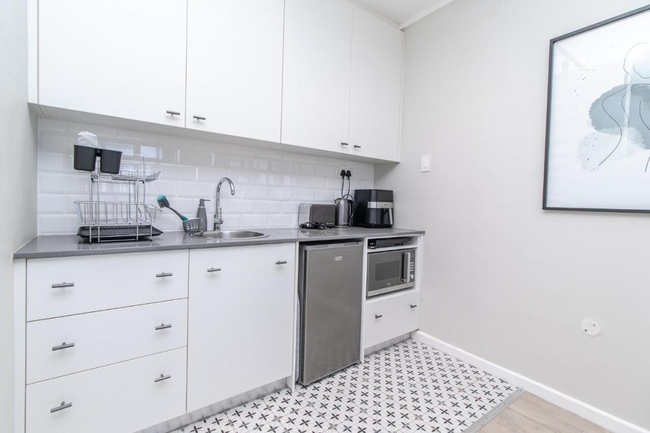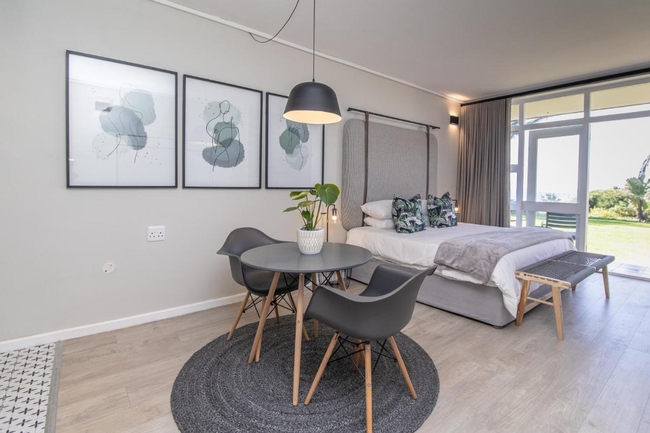 This elegant studio offers breathtaking ocean views and is designed for a comfortable stay. It features a king-size bed, an en-suite bathroom with a walk-in shower, and a fully-equipped kitchenette. The open-plan layout includes a 2-seater dining area and a Smart TV with free Wi-Fi for your entertainment. The kitchenette is equipped with an induction stove, air-fryer, microwave, bar fridge, and all necessary cutlery and crockery, along with tea and coffee-making facilities. The bathroom includes a walk-in shower, washbasin, and toilet, with linen and bath towels provided (please bring your own swimming towels). Step through the double doors to a covered patio where you can enjoy your morning coffee or evening sundowner. The property also offers a shared swimming pool and braai area for your enjoyment.