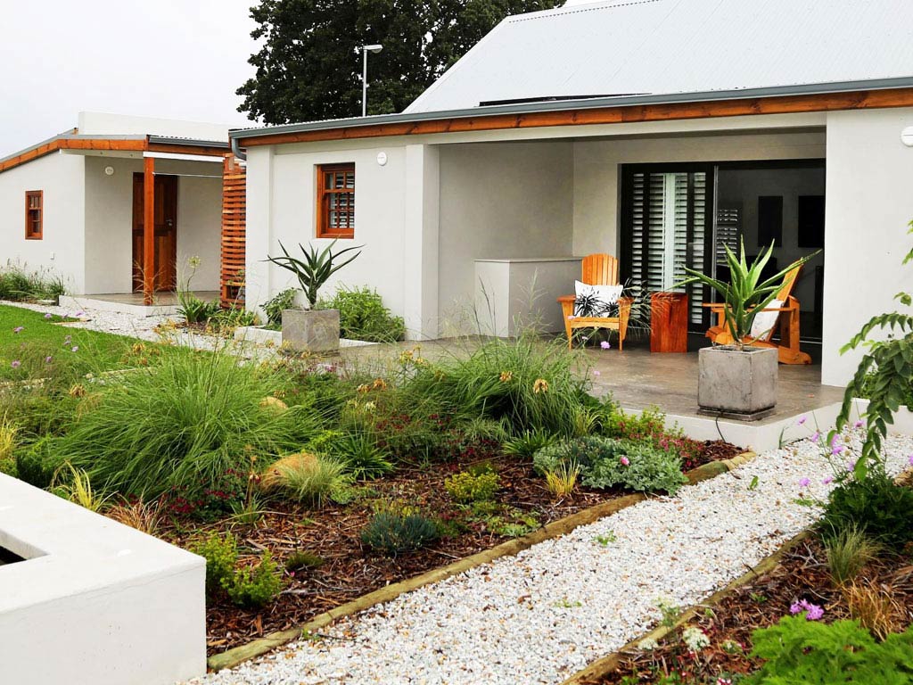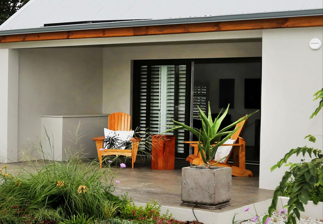 Sliding doors open onto a covered veranda that looks onto a lovely indigenous garden, water feature and fantastic mountain views. Handcrafted Adirondack chairs provide comfortable seating, with a built in braai set to one side. A cottage garden has been planted with herbs for guests to use.