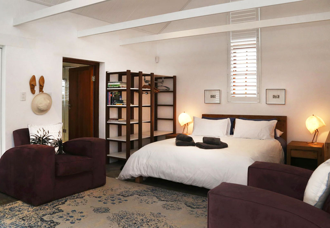 40 On Longmarket is a cottage in Stanford that has had interior walls removed and the ceiling opened to create a double volume and an airy, light space. The cottage is furnished with a Queen-size extra length bed and the en-suite bathroom, is set on one side of the open plan room. There is adequate hanging and drawer space with a built-in power bank for electrical equipment. The bathroom is fitted with a large walk in shower with a luxurious shower head. There is generous storage space for personal bathroom belongings and a large mirror over the basin. Linens are of excellent quality, with high thread count and thick towels. A central seating space is furnished with over-stuffed Art Deco chairs, with a wood burning stove to keep the cottage cosy on a chilly night. The dining table is created out of recycled wood, glass and steel, it has 4 very comfortable leather chairs, inviting extended visits around the table. A small but adequate kitchen is equipped with Smeg gas/electric stove and Smeg fridge/freezer. It is fully equipped with all necessary appliances and utensils, including microwave. Sliding doors open onto a covered veranda that looks onto a lovely indigenous garden, water feature and fantastic mountain views. Handcrafted Adirondack chairs provide comfortable seating, with a built in braai set to one side. A cottage garden has been planted with herbs for guests to use. Doors and windows have been fitted with American shutters, allowing for air flow, and security. Covered off street parking provided behind lockable sliding gate.