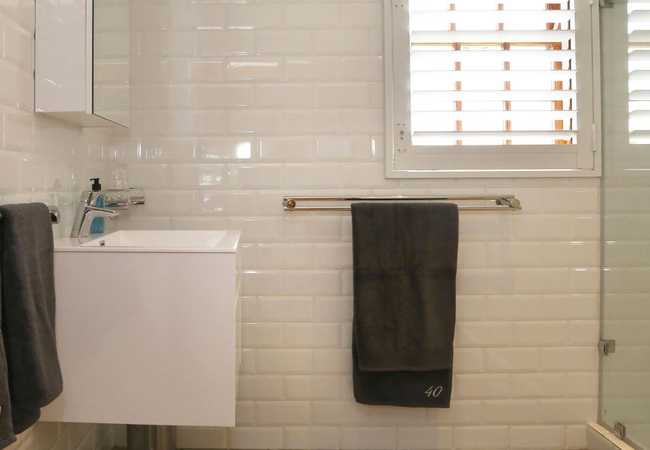 The bathroom is fitted with a large walk in shower with a luxurious shower head. There is generous storage space for personal bathroom belongings and a large mirror over the basin. Linens are of excellent quality, with high thread count and thick towels.