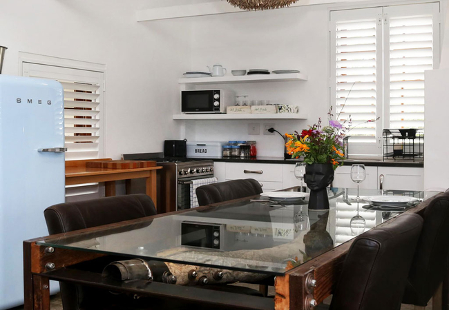 A central seating space is furnished with over-stuffed Art Deco chairs, with a wood burning stove to keep the cottage cosy on a chilly night. The dining table is created out of recycled wood, glass and steel, it has 4 very comfortable leather chairs, inviting extended visits around the table.