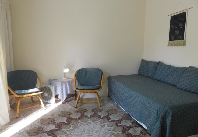 The cottage is furnished with a double bed. There is an open plan dining and seating area for relaxing and watching TV. The kitchen is equipped with a microwave oven, two plate stove, oven and fridge. There is also a private garden with a braai area. Tables, chairs and sun loungers are provided.