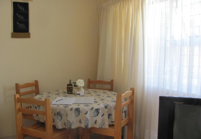 Guinea Fowl Cottage sleeps up to four guests. This unit is equipped with a ceiling fan, wall safe, King or two single beds with another two single beds in the lounge. The lounge has two armchairs, a dining table and chairs as well as a TV with M-Net and DStv. The fully equipped kitchen provides a fridge / freezer, microwave, two plate stove with oven, crockery and cutlery. Hair dryer, bed linen and towels are provided.