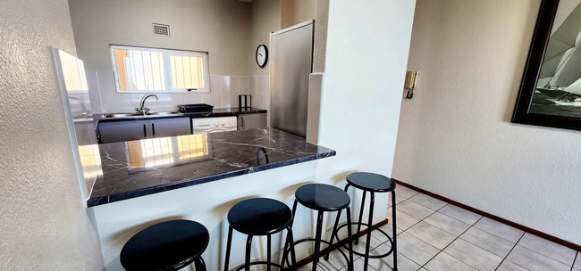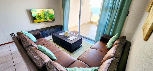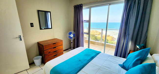 The kitchen is equipped with a fridge-freezer, stove, microwave, and washing machine, and also features a breakfast nook with seating for four. The lounge is furnished with inviting couches and a Smart TV, while Wi-Fi access allows guests to enjoy streaming their favourite shows. Sliding doors open onto a spacious balcony that showcases uninterrupted views of the ocean. Here, guests can relax on outdoor furniture or make use of the built-in braai for leisurely meals.