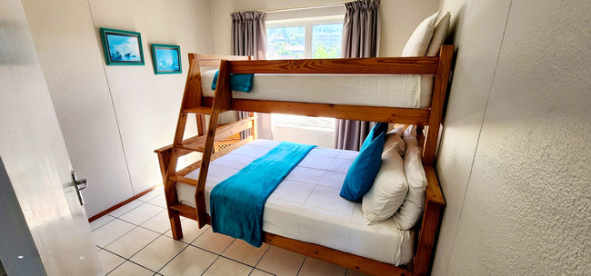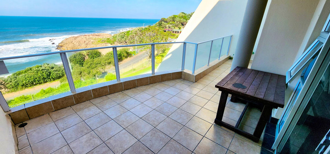 This first-floor apartment offers two bedrooms and a bathroom fitted with a shower, toilet, and basin. The main bedroom contains a double bed, while the second bedroom has a tri-bunk bed, making it suitable for both adults and children. Ceiling fans are fitted in both rooms for comfort. The kitchen is equipped with a fridge-freezer, stove, microwave, and washing machine, and also features a breakfast nook with seating for four. The lounge is furnished with inviting couches and a Smart TV, while Wi-Fi access allows guests to enjoy streaming their favourite shows. Sliding doors open onto a spacious balcony that showcases uninterrupted views of the ocean. Here, guests can relax on outdoor furniture or make use of the built-in braai for leisurely meals. The complex offers a range of shared facilities including a swimming pool, tennis court, children’s play area, and a communal braai area, as well as a laundry room for convenience. Each unit has its own carport, and additional visitor parking is available. A private gate provides direct access to Lawrence Rocks Beach, where visitors can enjoy the thrill of deep-sea fishing along the KwaZulu-Natal coast. Dolphins are often spotted in the surf, and during the migration season, whales can sometimes be seen offshore.