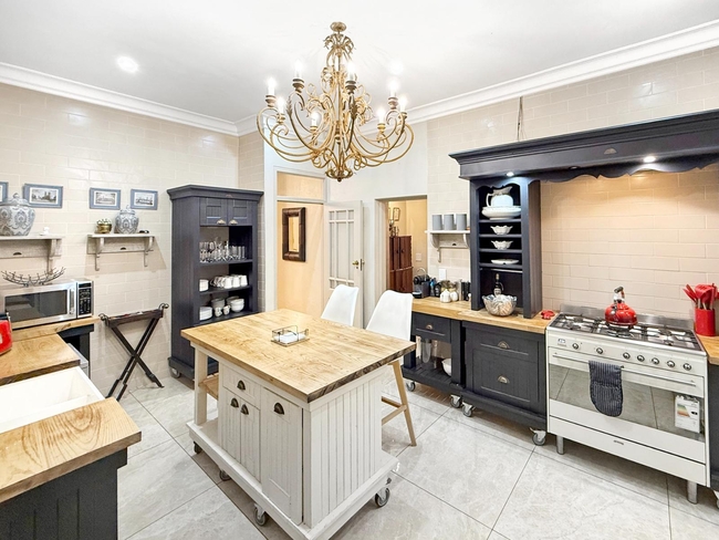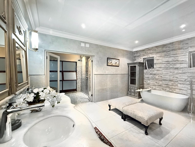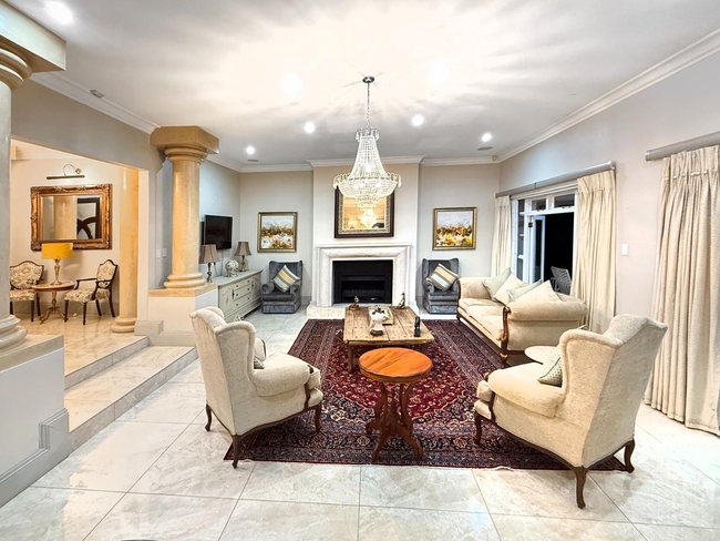 This refined six-bedroom, five-and-a-half-bathroom residence showcases a perfect balance of style and functionality. Guests are welcomed by an impressive double-sided Koi pond at the entrance, followed by a grand foyer adorned with a striking crystal chandelier. The home’s thoughtful layout places three bedrooms and two full bathrooms, including the main en-suite, in the left wing. The right wing hosts two further bedrooms, each with its own dedicated bathroom. A more recent addition to the property is the sixth double en-suite bedroom, located a short distance from the main house, offering privacy and independence. Indoors, a bespoke and fully equipped kitchen caters to all culinary needs, complemented by an elegant dining area that invites leisurely meals and conversation. Outdoor living is equally inviting, with an undercover entertainment space ideal for al fresco gatherings set against the backdrop of landscaped gardens. The property also features a large private swimming pool. For uninterrupted comfort, a robust solar system ensures continuous power, while a JoJo water tank provides backup supply. Guests are personally welcomed by the owners or housekeeper and enjoy exclusive use of the entire home, its landscaped grounds, and all entertainment facilities.