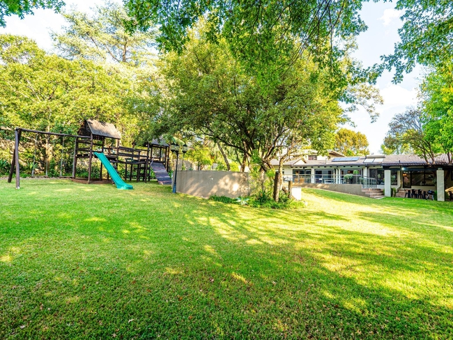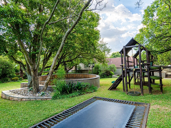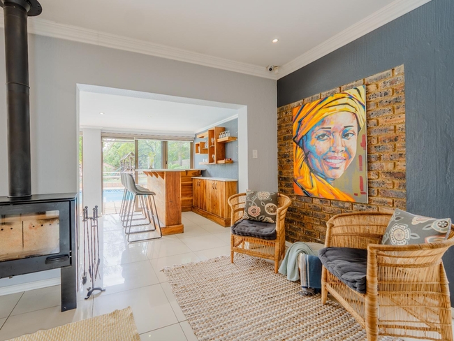 4 On Mangaan has three en-suite bedrooms with garden views. The main bedroom is furnished with a Queen-size bed and a sleeper couch suitable for a young child. There is also a cot for a baby. The second and third bedrooms each have a double bed. The en-suite bathrooms are fitted with a shower or bath. The well-equipped kitchen contains the necessary appliances to prepare and cook meals. The living area has a large dining table with seating, a built-in bar area, sofas to relax on and a TV for media entertainment. The living area leads out to the backyard, which boasts a large boma with a braai facility, a beautiful seasonal swimming pool, and a spacious garden. Free Wi-Fi is also available. The property has full security features and secure parking.