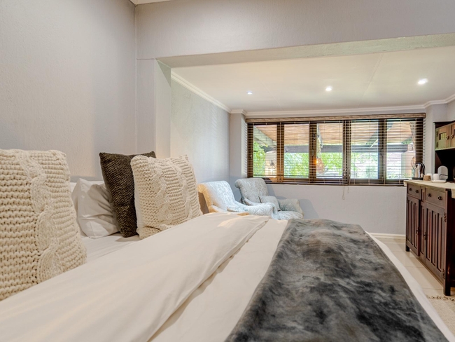 4 On Mangaan is a self catering holiday home with three en-suite bedrooms with garden views. The main bedroom is furnished with a Queen-size bed and a sleeper couch suitable for a young child. There is also a cot for a baby. The second and third bedrooms each have a double bed. The en-suite bathrooms are fitted with a shower or bath.