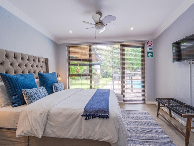 The well-equipped kitchen contains the necessary appliances to prepare and cook meals. The living area has a large dining table with seating, a built-in bar area, sofas to relax on and a TV for media entertainment. The living area leads out to the backyard, which boasts a large boma with a braai facility, a beautiful seasonal swimming pool, and a spacious garden. Free Wi-Fi is also available.