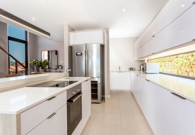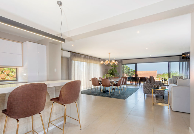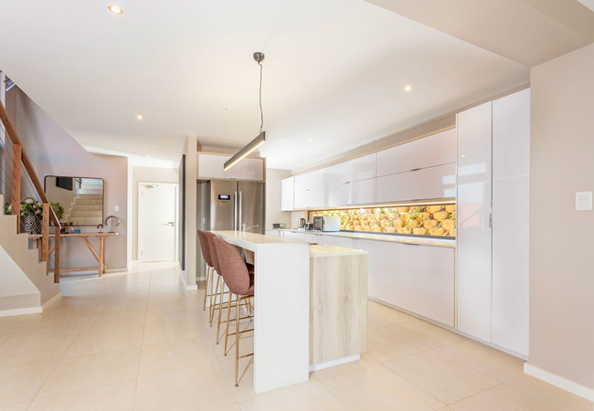 4 Zimbali Hills is a self catering holiday home sleeping eight guests in four bedrooms. Upstairs are four spacious bedrooms, all with en-suite bathrooms and a pajama / TV lounge and giant poof separating the bedrooms and completing the luxury feel of this level. Three rooms have Queen-size beds and one has two single beds. The open plan design of the living areas seamlessly flow onto the covered patio with small intimate garden. The open plan kitchen has plenty preparation space and a centre island, it overlooks the dining area and comfortable lounge. Outside there is an intimate garden with a gas braai and a double garage for two vehicles.