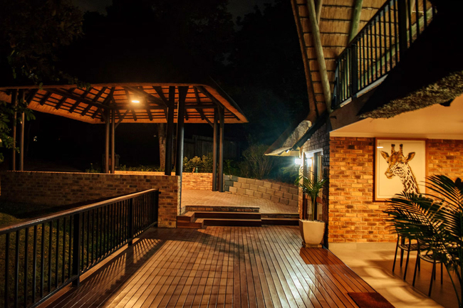 Large sliding doors lead to a spacious covered patio, complete with an outdoor dining table and a built-in braai, perfect for al fresco meals. This inviting space flows onto a wooden deck, where guests can enjoy the sights and sounds of the surrounding bushveld. A refreshing splash pool adds to the appeal, offering the chance to unwind while observing wildlife in their natural habitat. Secure parking is provided, ensuring peace of mind throughout your stay.