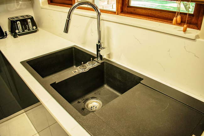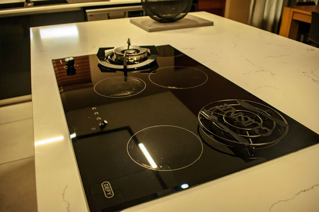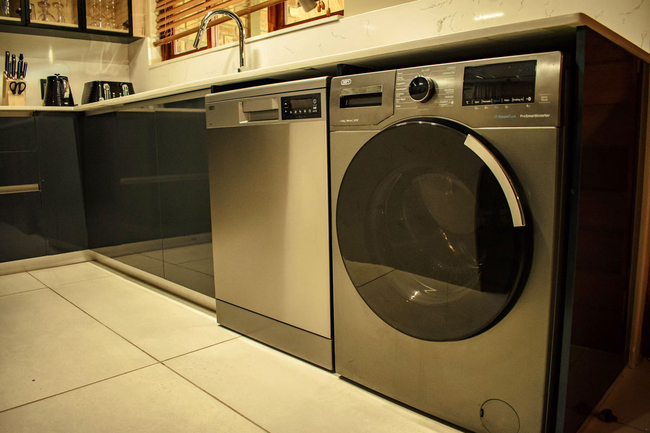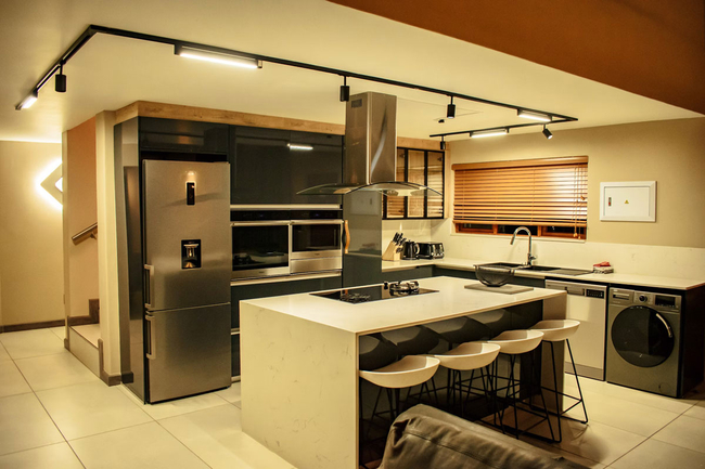 The air-conditioned open-plan living area includes a fully equipped kitchen, which is fitted with a stove, oven, microwave, fridge-freezer, dishwasher, and washing machine, along with all necessary cutlery and crockery. A breakfast bar with stools complements the space.