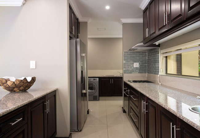There is air conditioning and the lounge has a TV with DStv satellite channels. The kitchen is fully equipped and boasts a washing machine, tumble dryer and dishwasher for convenience.