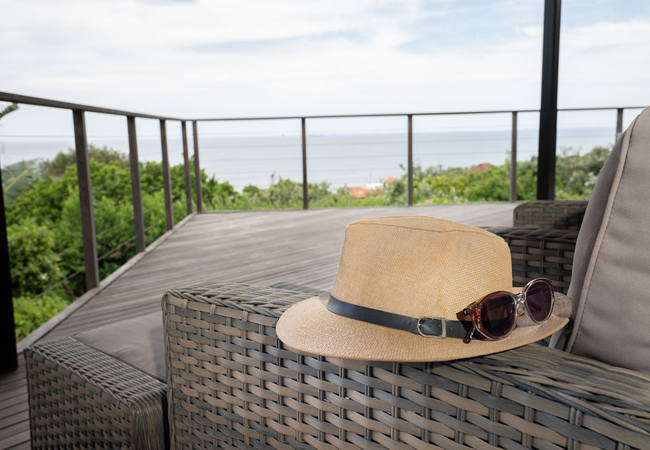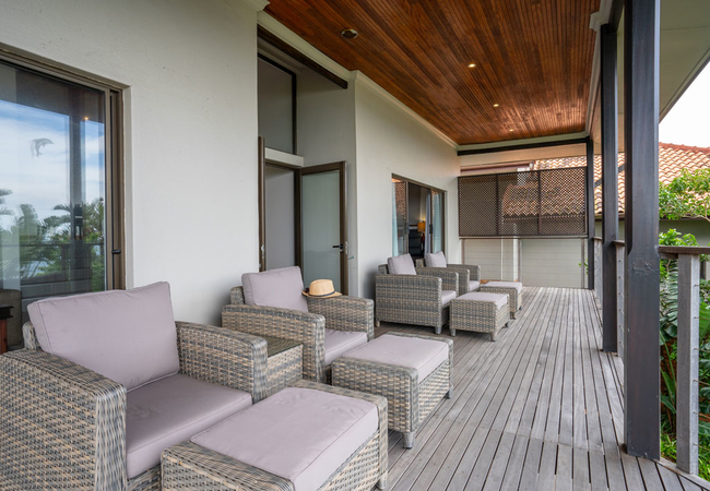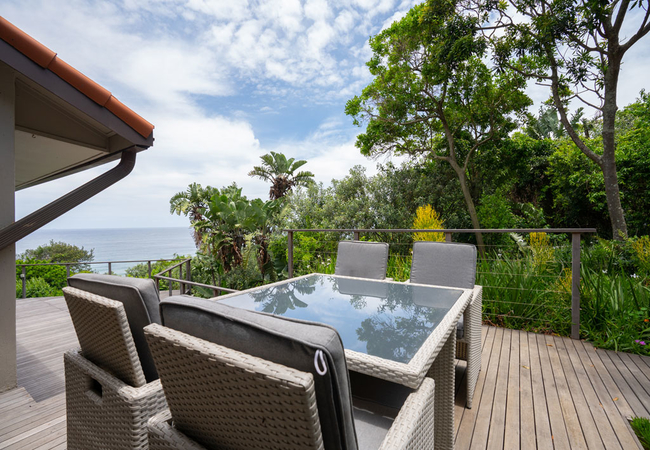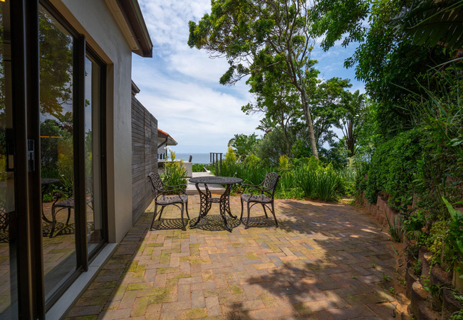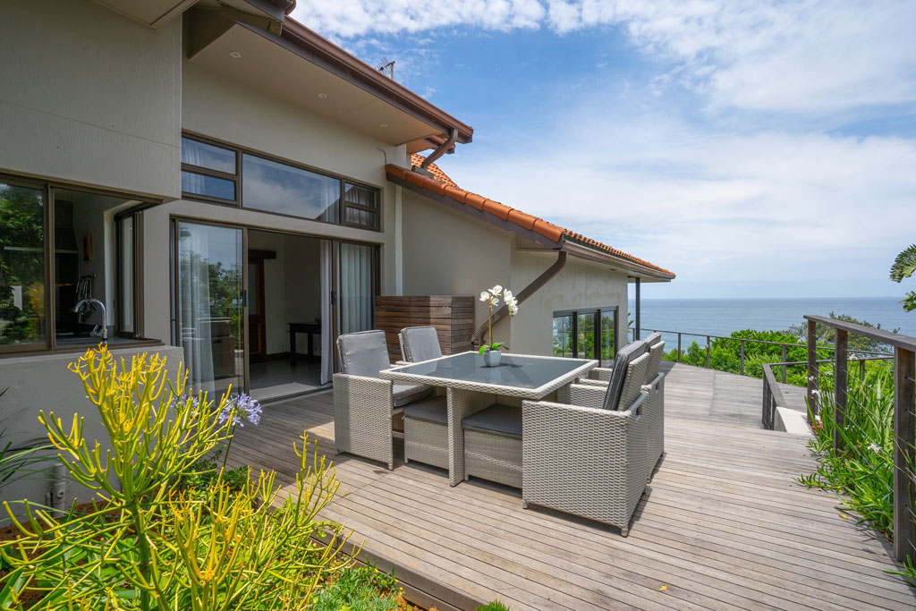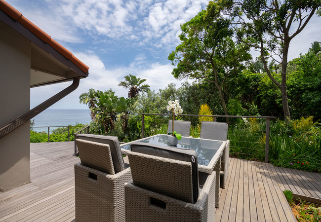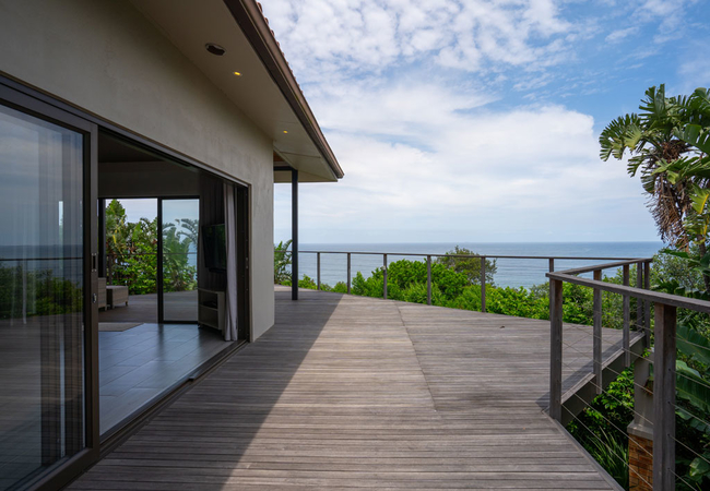 5 Zimbali Ridge is a self catering holiday home sleeping eight guests in four bedrooms. Each bedroom has a Queen-size bed and an en-suite bathroom. Two rooms are on the lower floor level. The bedrooms are separated by a ‘pajama' lounge, leading onto the garden. There are both shower and bath facilities available for guests. The ground floor entrance level provides distinct and enticing entertainment areas with the living area leading out onto an extended deck and vast ocean views. The living area commands a prime sea facing position making for jaw-dropping vistas that will delight and amaze guests. The kitchen is clean, modern and contains everything required for a comfortable stay. There are braai facilities, a private pool and secure garage parking.