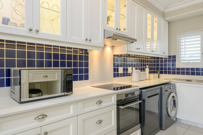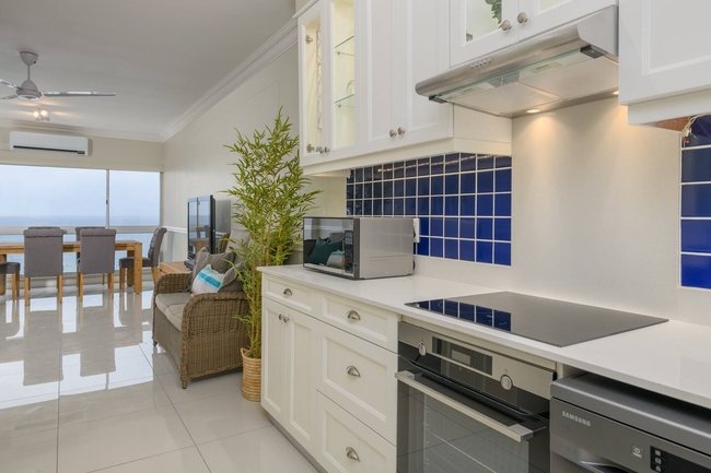 Start your day with panoramic views of the Indian Ocean, stretching as far as the eye can see in both directions. The natural beauty of the coastline enhances your stay, offering a tranquil and ever-changing backdrop. The apartment features three comfortable bedrooms: the master bedroom with a double bed, the second with two single beds, and the third also with a double bed. The two bathrooms each have a shower, washbasin, and WC.