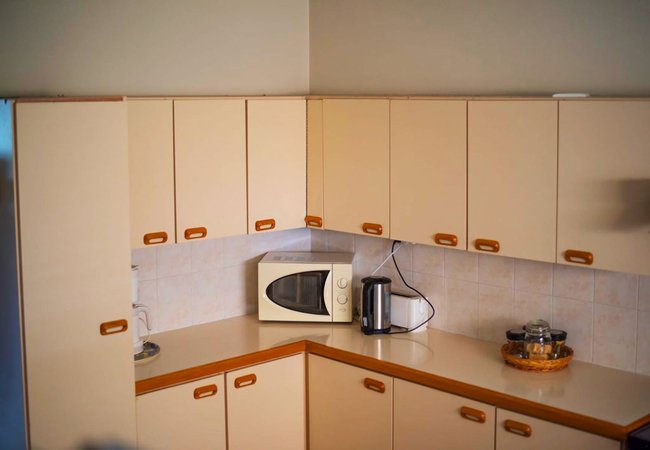 Fully equipped kitchen with fridge, two plate stove / oven, kettle, toaster