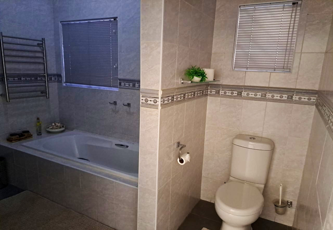 This unit can accommodate up to 4 adults and features 2 en-suite bedrooms. The main bedroom is furnished with a queen-size bed and an en-suite bathroom fitted with a bath. The second bedroom contains 2 single beds and an en-suite bathroom fitted with a shower. Other in-room facilities include a living room, ceiling fans, a TV with a full selection of DStv channels, Wi-Fi and a kitchen. The kitchen is equipped with a fridge, oven, stove, microwave as well as tea- and coffee-making facilities.