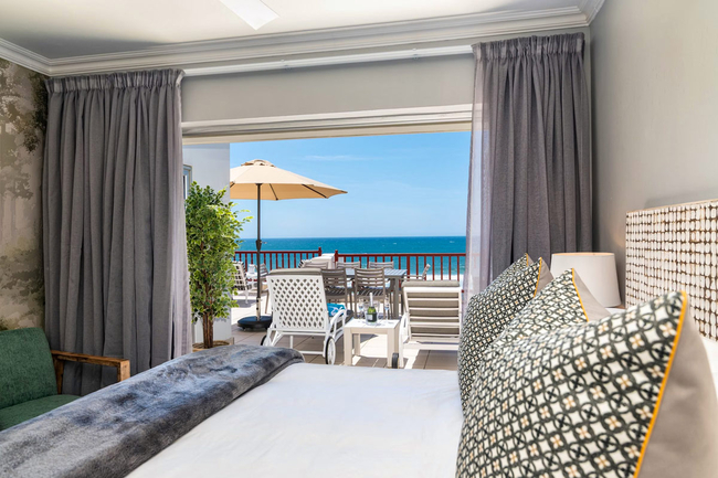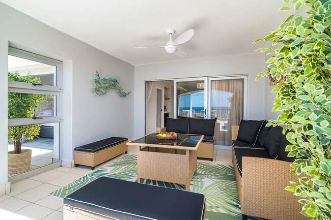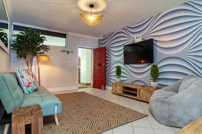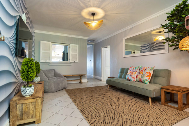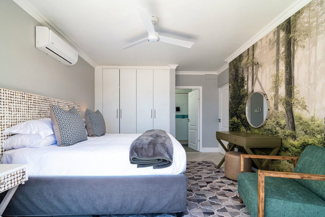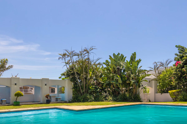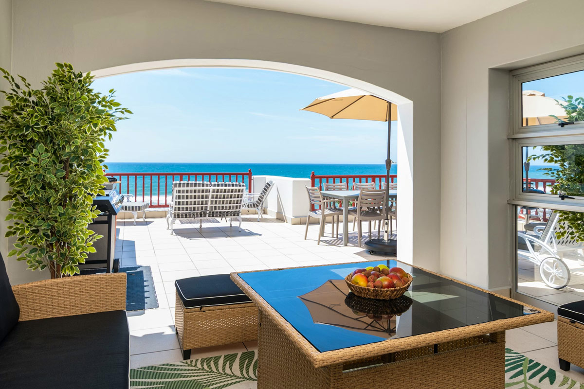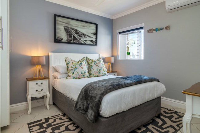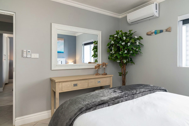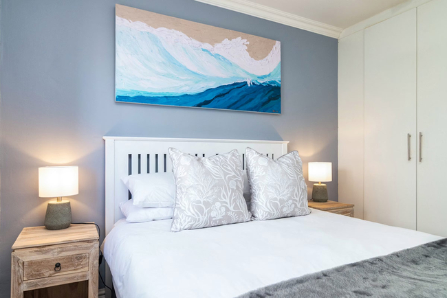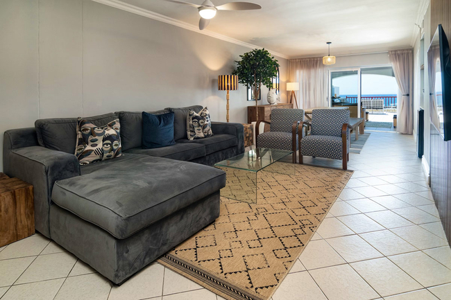 The apartment comfortably accommodates up to nine guests across four well-appointed bedrooms. The main bedroom features a king-size bed and a private en-suite bathroom complete with a bath, shower, toilet and basin. The second bedroom is furnished with a double bed, while the third bedroom offers two single beds, and the fourth bedroom includes a further double bed. A single sleeper couch is available in the living area for additional flexibility. The second bathroom is fitted with a shower, toilet and basin. Fresh bed linen and bath towels are provided for guest convenience. The open-plan living space incorporates a fully equipped kitchen with a fridge-freezer, stove, oven, airfryer, dishwasher, washing machine and tea and coffee-making facilities, ensuring a practical and comfortable self-catering experience. The lounge area is tastefully furnished with ample seating and a television, and complimentary high-speed Wi-Fi is available throughout. This living area opens onto a veranda furnished with outdoor seating and braai facilities, offering pleasant views of the garden and surrounding coastal environment. Guests may enjoy the use of the communal swimming pool, secure on-site parking and direct beach access. The apartment’s central position allows for effortless access to nearby restaurants and a variety of coastal pursuits, making it particularly well suited to families and groups seeking both convenience and relaxation.