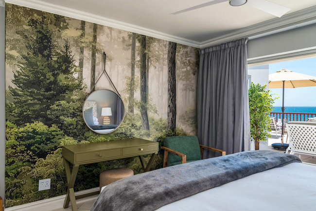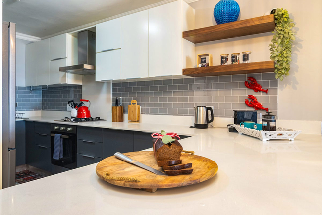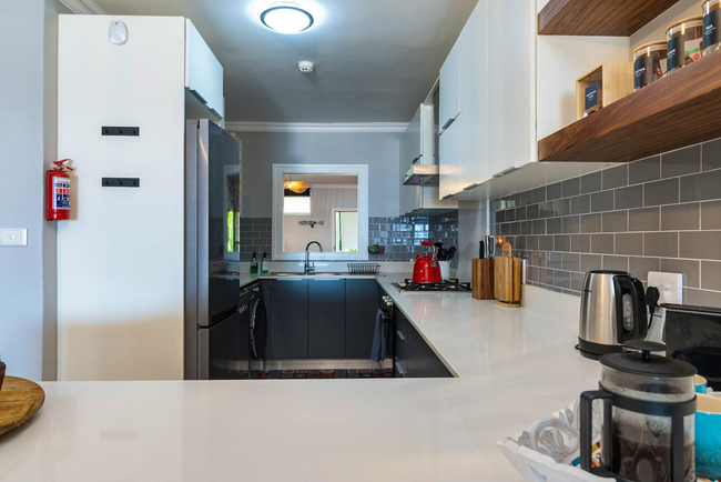 The open-plan living space incorporates a fully equipped kitchen with a fridge-freezer, stove, oven, airfryer, dishwasher, washing machine and tea and coffee-making facilities, ensuring a practical and comfortable self-catering experience. The lounge area is tastefully furnished with ample seating and a television, and complimentary high-speed Wi-Fi is available throughout. This living area opens onto a veranda furnished with outdoor seating and braai facilities, offering pleasant views of the garden and surrounding coastal environment.