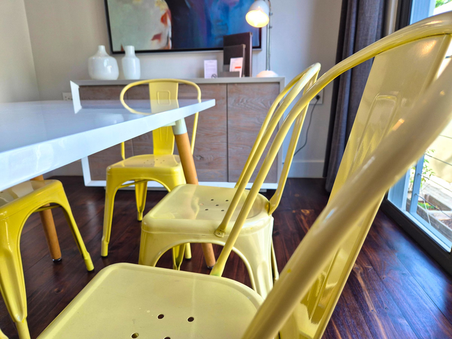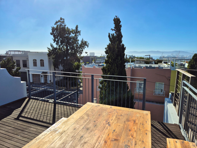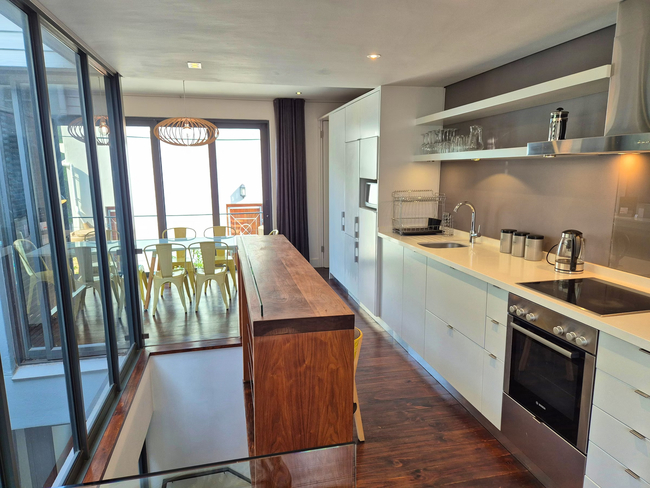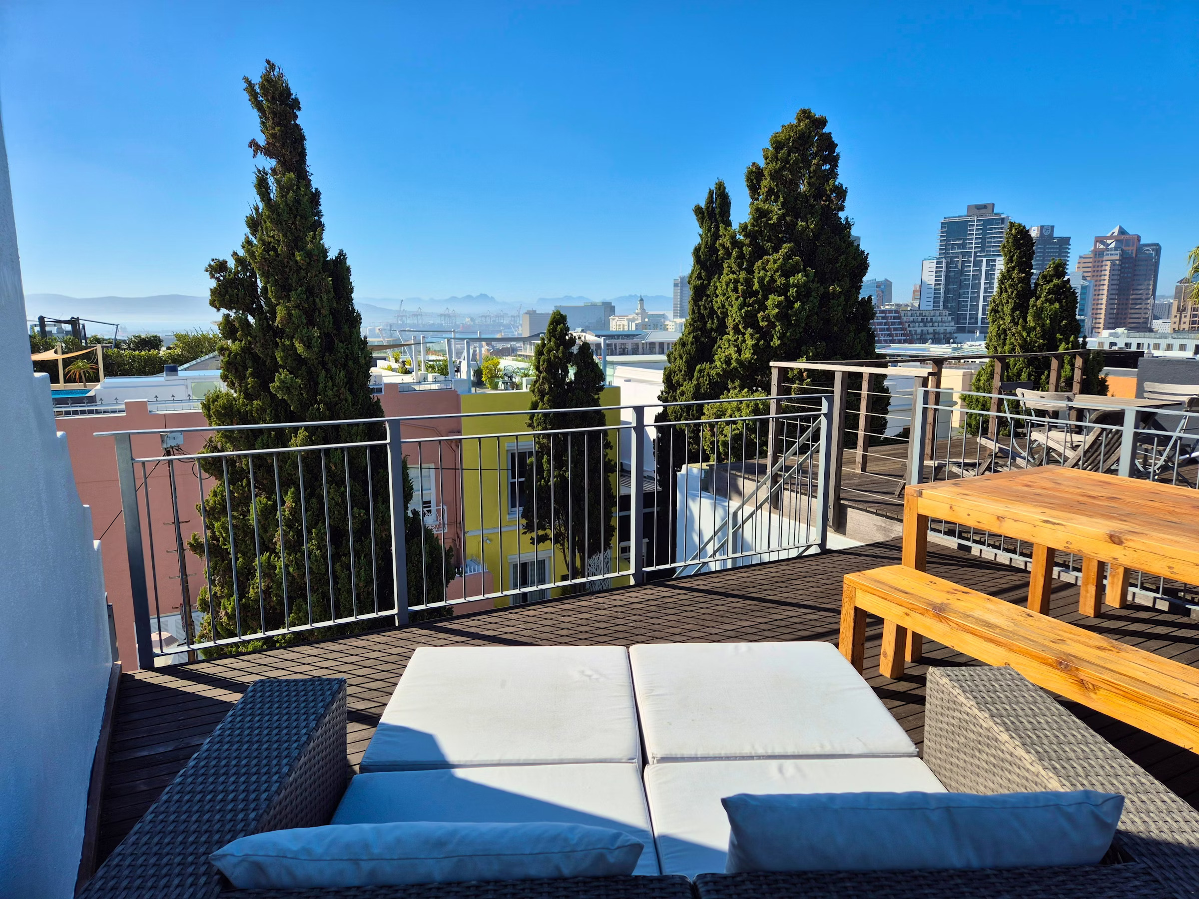 The kitchen is fitted with a refrigerator, stove, oven, microwave, and coffee and tea-making facilities. Wooden steps from the balcony ascend to a spacious rooftop terrace, offering panoramic views of the village, the cityscape, and Signal Hill.