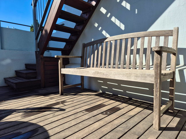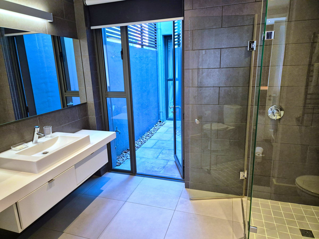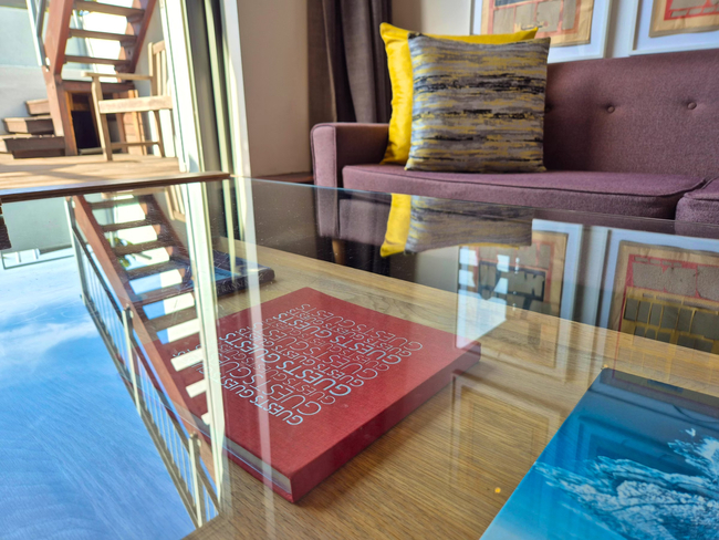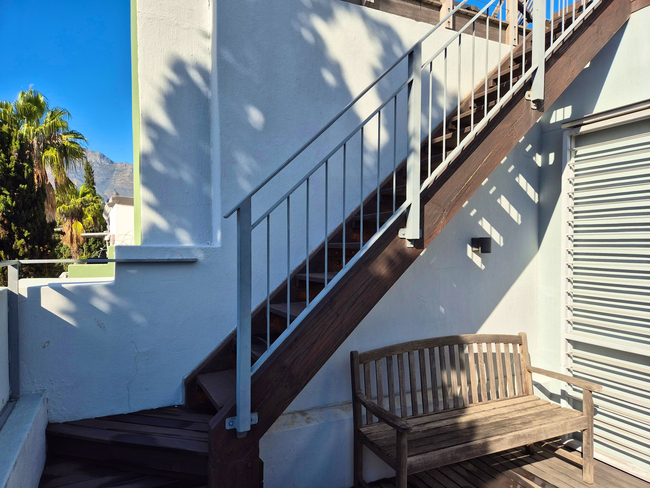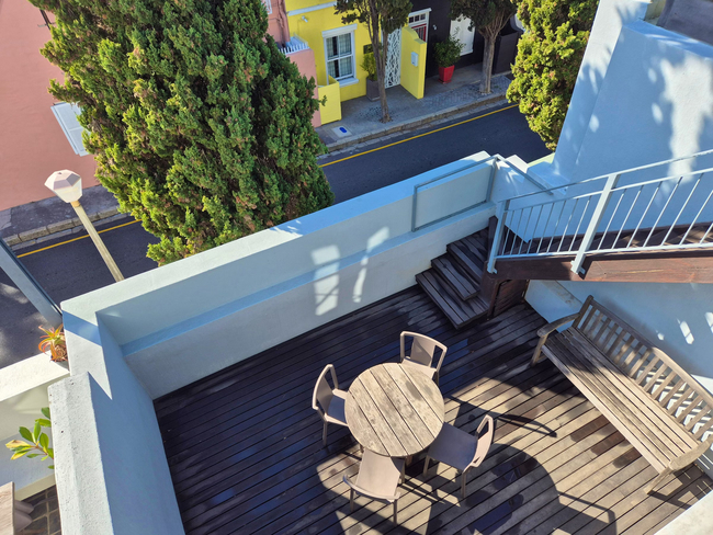 Accommodating up to four guests, the house offers two air-conditioned bedrooms on the ground floor. The front bedroom, with a king-size bed, features a spacious walk-through dressing area that leads to an en-suite bathroom with a shower and access to a private courtyard. The rear bedroom, overlooking the same courtyard, is furnished with a queen-size bed and also includes an en-suite bathroom with a shower. Complimentary Wi-Fi is provided for guests' convenience. The primary living area is located on the first floor, separated by a glass balustrade staircase and framed by floor-to-ceiling windows with views of the courtyard. Designed with a modern aesthetic, this space comprises a 6-seater dining area and a fully equipped kitchen that opens to an elegant lounge with sliding glass doors leading to a decked balcony. The kitchen is fitted with a refrigerator, stove, oven, microwave, and coffee and tea-making facilities. Wooden steps from the balcony ascend to a spacious rooftop terrace, offering panoramic views of the village, the cityscape, and Signal Hill.