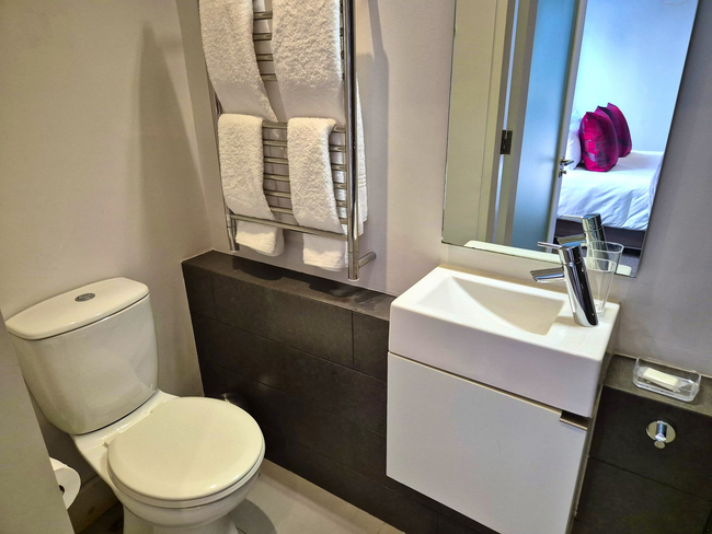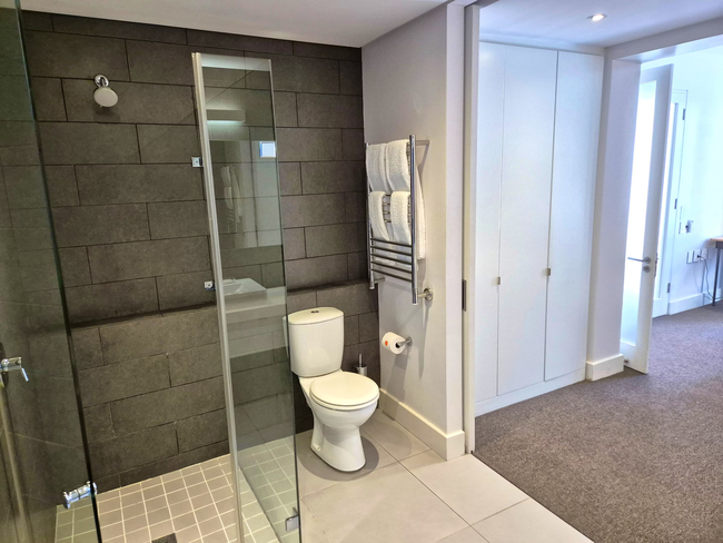 The rear bedroom, overlooking the same courtyard, is furnished with a queen-size bed and also includes an en-suite bathroom with a shower. Complimentary Wi-Fi is provided for guests' convenience.