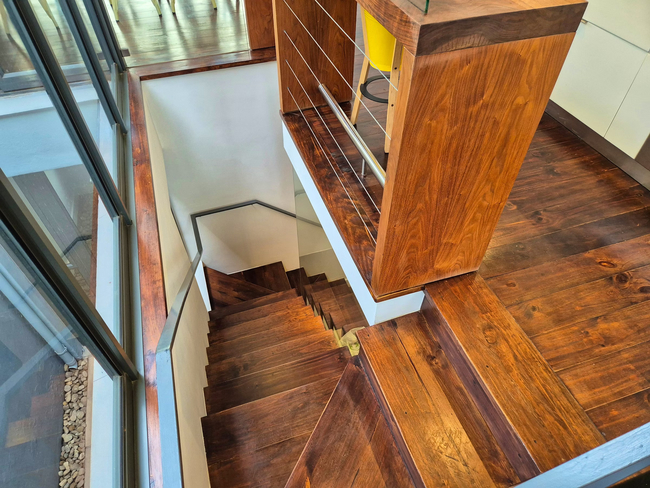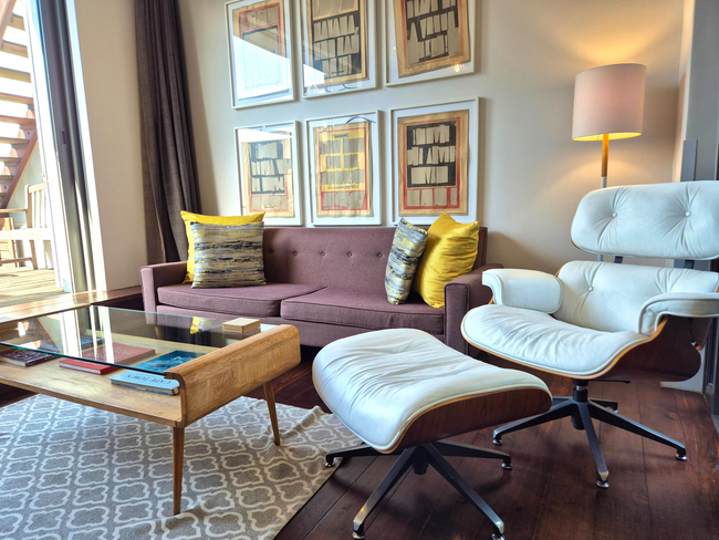 The primary living area is located on the first floor, separated by a glass balustrade staircase and framed by floor-to-ceiling windows with views of the courtyard. Designed with a modern aesthetic, this space comprises a 6-seater dining area and a fully equipped kitchen that opens to an elegant lounge with sliding glass doors leading to a decked balcony.