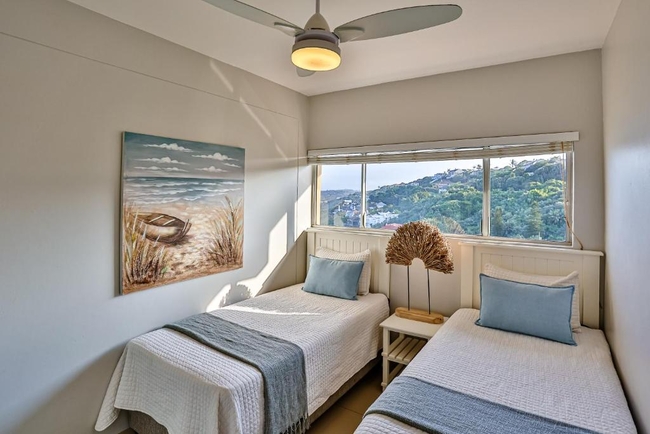 This elegant apartment accommodates up to six guests, featuring three bedrooms, two bathrooms, and an open-plan kitchen and living area. The master bedroom, complete with air conditioning, has a queen-size bed and an en-suite bathroom equipped with a bath, shower, toilet, and washbasin. The second bedroom includes a double bed, while the third bedroom offers two single beds. These two rooms share a bathroom that includes a shower-over-bath, toilet, and washbasin. The well-appointed kitchen is perfect for self-catering, equipped with a fridge-freezer, stove, oven, microwave, kettle, toaster, and dishwasher. A breakfast bar with stools adds to the convenience. The air-conditioned lounge area provides ample seating and a flat-screen TV, opening onto a balcony with stunning sea views. The Villa Royale complex features a communal swimming pool, a braai area with picnic benches, and direct access to the beach. Secure parking is also available.