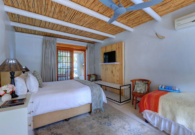 The Pool Room is furnished with a double bed and single bed. The en-suite bathroom has a shower. The rooms are comfortable, air-conditioned, spacious bedrooms, each with its own bathroom-en-suite, TV and DStv, fridge, coffee and tea making facilities.