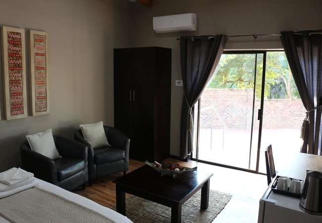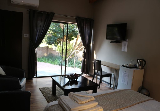 The room is spacious (24m²) and modern and has a queen size bed, en-suite bathroom and seating area. Garden view. TV, DSTV, high quality bedding and air-conditioning. Includes fridge and tea and coffee facilities. Each room offers Tea / coffee facilities, a fridge. DStv, High quality bedding and air-conditioning.