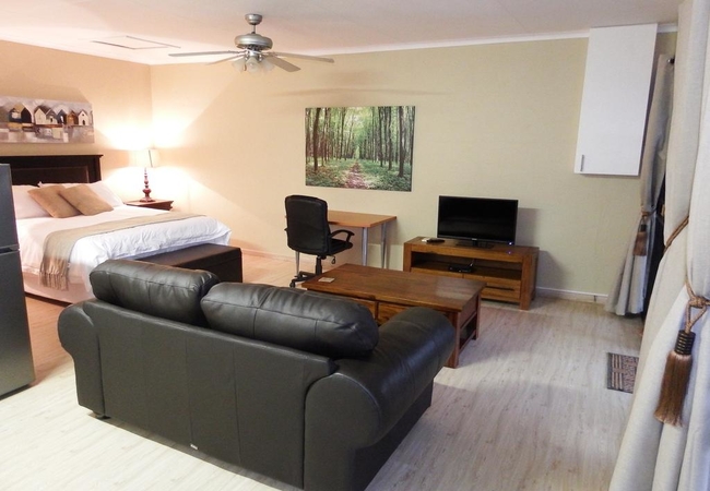 The room is spacious (50m²) and modern and has a queen size bed, en-suite bathroom and seating area. TV, DSTV, high quality bedding and air-conditioning. Includes a small kitchen with fridge, microwave, double hot plate and tea and coffee facilities.