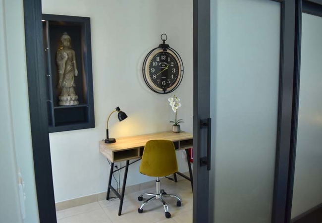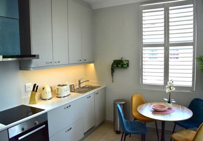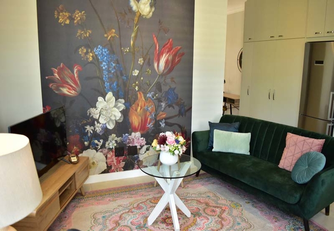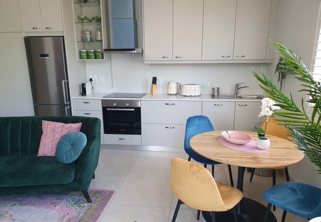 The stylish air-conditioned living, dining and kitchen area take full advantage of the great angled corner aspect of this property with Juliet balcony windows opening out onto village views. You can also see Table Mountain, above the neighbouring properties, from the comfortable colourful suede sofa and dining area.