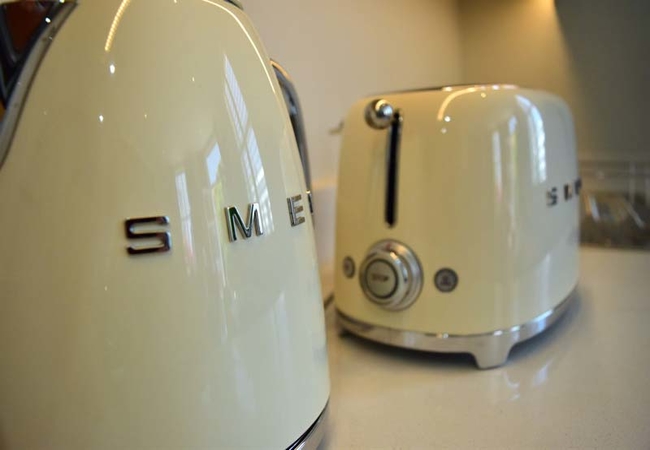 There is a TV with selected satellite channels and Wi-Fi is provided. The fully fitted modern kitchen stretches along one wall back towards the corridor and includes a washer / dryer.