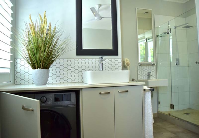The bathroom is open plan and is fitted with two sink areas, shower and separate toilet. A hairdryer and wall safe are included.