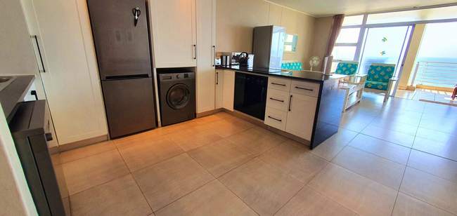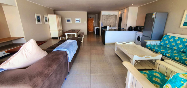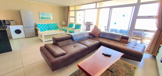 Sliding doors open from both the lounge and the main bedroom onto a spacious patio, where guests can admire the sea views. The patio is furnished with outdoor seating and includes a gas braai, making it ideal for relaxed dining and socialising in the open air.