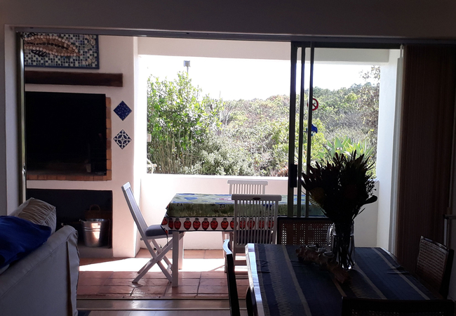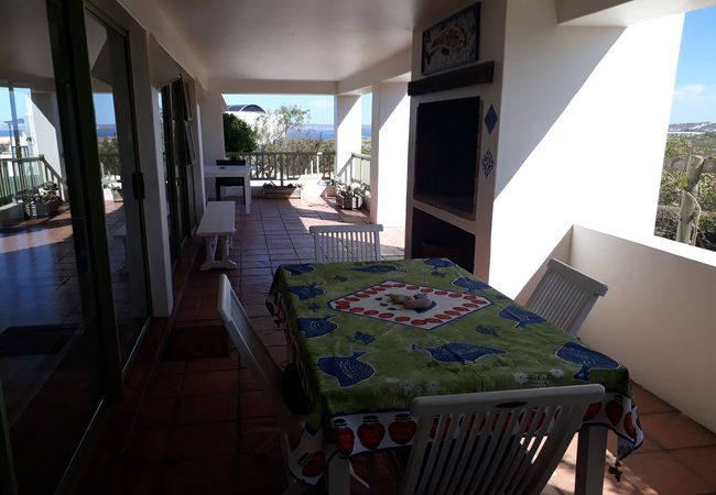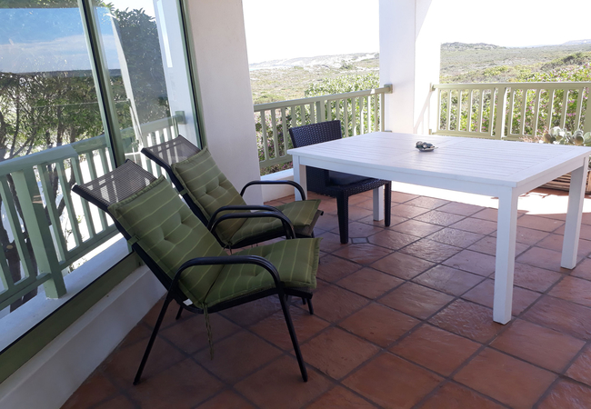 Perle of Paradise Beach Apartment is large and extremely comfortable with two double bedrooms en-suite. Spacious, secure, private, with uninterrupted views of dunes and bay. The kitchen is fully equipped with a dishwasher, microwave, iron and ironing board. There is a separate dining area off the kitchen with an oak dining table that seats eight persons. First bedroom has double bed, built in cupboards, desk, a sliding door onto veranda, and a bath with shower over bath. The second bedroom is has a queen size double bed, double sleeper bunk, built in cupboard, and shower. A special feature skylight lets in plenty of sun light into the room. There is an extra outdoor hot water shower with private door leading onto it for the romantic or adventurous. A large built in braai is provided on the wide undercover veranda and the comfortable lounge has a cosy wood burning indoor fireplace. A TV / DVD player and full DStv package is available. We supply all bedding, towels, beach towels are available if necessary. Sheets and towels are replaced and the flat is cleaned once a week. There is secure off road private parking for two cars. The apartment sleeps six and is suitable for four adults and two children. Smoking is only allowed outside on the veranda.