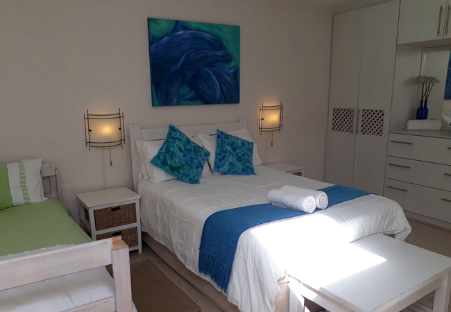 First bedroom has double bed, built in cupboards, desk, a sliding door onto veranda, and a bath with shower over bath. The second bedroom is has a queen size double bed, double sleeper bunk, built in cupboard, and shower. A special feature skylight lets in plenty of sun light into the room. There is an extra outdoor hot water shower with private door leading onto it for the romantic or adventurous.