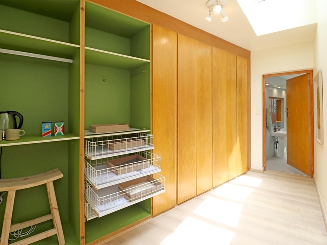 Inspired by the 1950s “township lounge studios” of photographer Ronald Ngilima, Home Economics is a deluxe garden-view room featuring a queen-sized bed and a modern shower. The space includes a kitchenette with a microwave and bar fridge, as well as a dining table or desk and a charming Juliet balcony. Guests can enjoy added conveniences such as coffee and tea facilities, Wi-Fi, hypoallergenic pillows, bathroom essentials, a security system, and voltage adaptors, all within a non-smoking environment designed for comfort and ease.