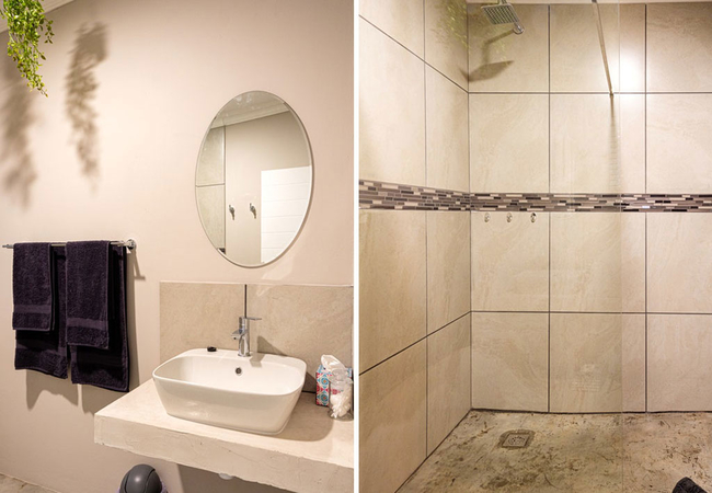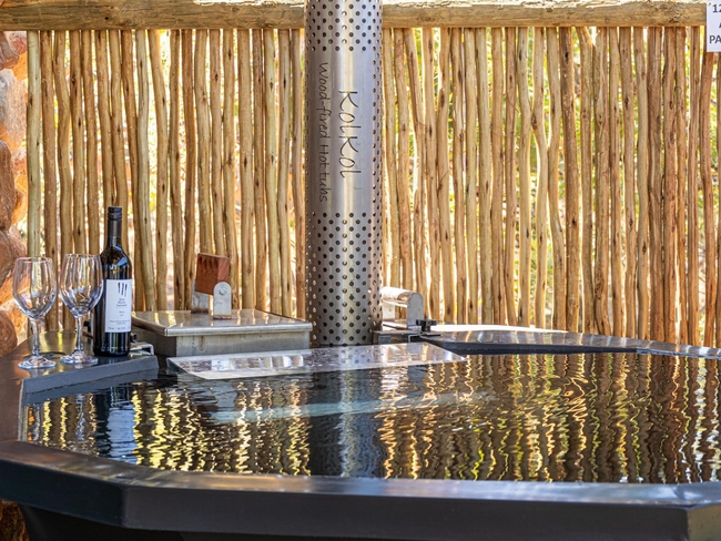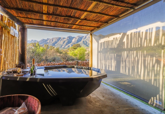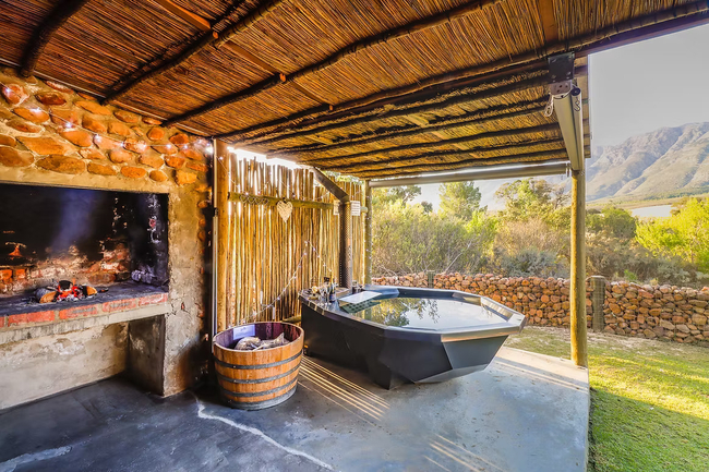 The living area leads out to the veranda, which offers a built in braai, a wood fired hot tub and stunning views of the farm and surrounding mountains.