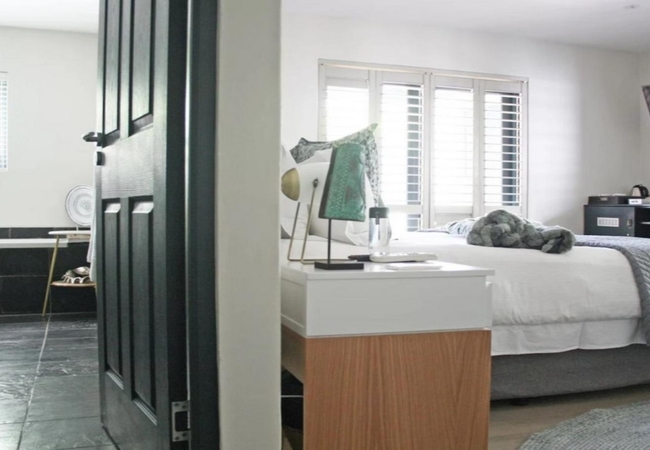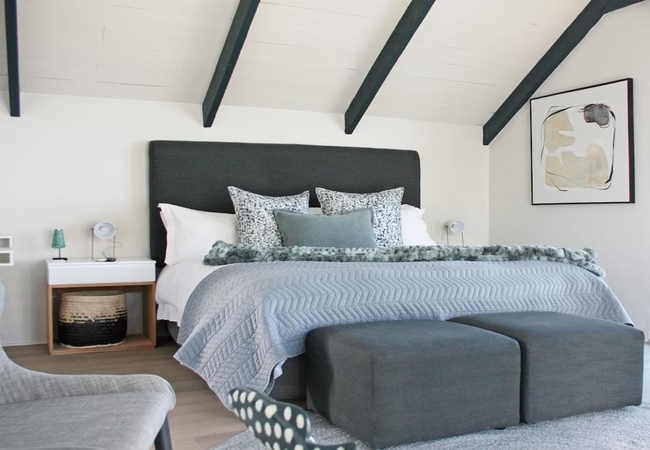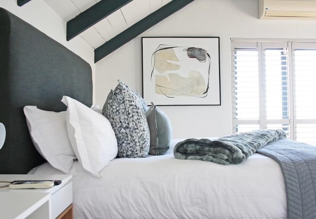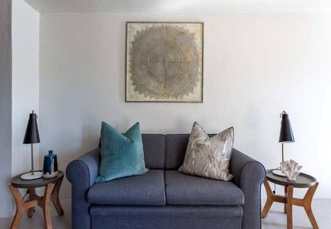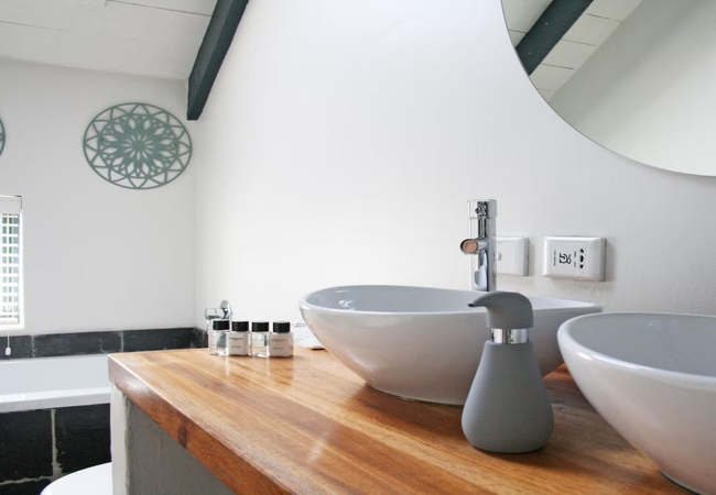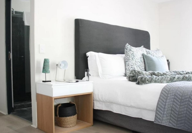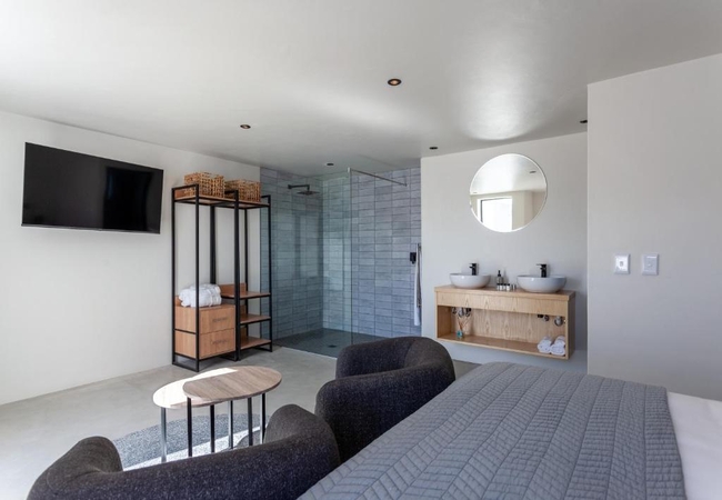 Ground floor and first floor bedrooms furnished with a King size bed or twin beds with white cotton linen. The en-suite bathroom is fitted with a bath and shower, toilet and basin. The room is equipped with air con, a flat screen Smart TV with select DStv channels and a stocked bar fridge. Ground floor rooms have private garden patio and entry from swimming pool courtyard. First floor rooms have private balcony. No sea views.