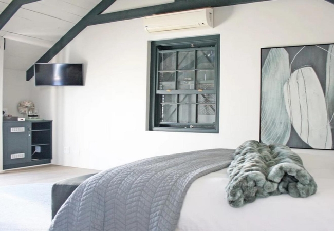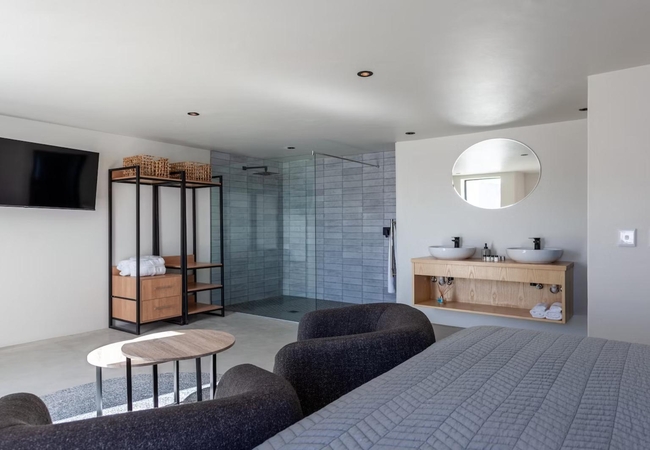 Each standard loft is furnished with a king-size bed with white cotton linen. The en-suite bathroom is fitted with a bath and a shower, toilet and basin. There is air-conditioning, a Smart TV, Wi-Fi, a safe, and stocked minibar fridge.