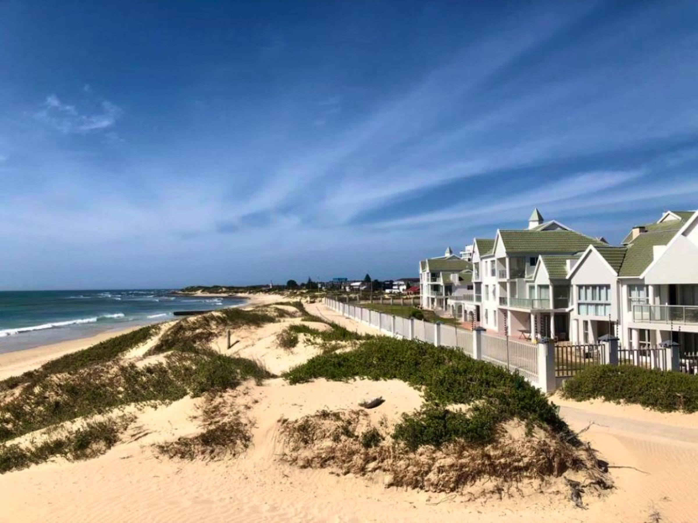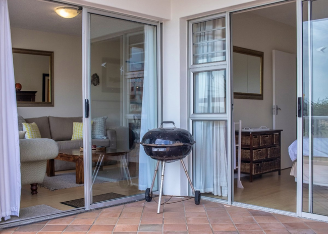 The living room extends to a patio with braai facilities, where guests can enjoy the soothing sounds of the waves and admire the sunset over the beachfront. The communal swimming pool and beachfront walks add to the appeal of this delightful property.