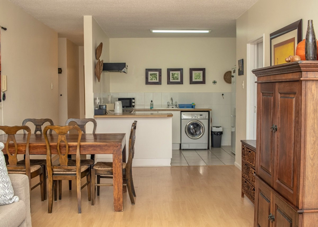The main living area boasts an open-plan design, comprising a kitchen, dining space, and lounge area. The lounge is tastefully decorated with comfortable couches and a dining table with chairs. Adjacent to the lounge is the fully equipped kitchen, which includes a fridge-freezer, microwave, stove, oven, basic crockery, cutlery, and tea- and coffee-making facilities. A washing machine is also available for guests' convenience.