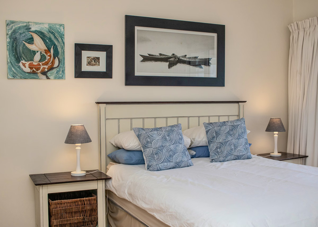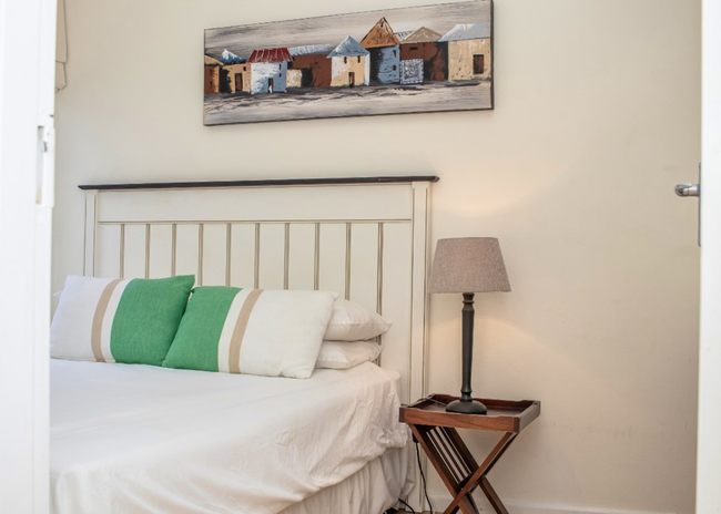 This apartment accommodates four guests in two bedrooms, featuring two bathrooms. The main bedroom is furnished with a queen-size bed and includes an en-suite bathroom equipped with a shower, basin, and toilet. The second bedroom, with a double bed, utilizes the guest bathroom, which features a bath with a hand-held shower, basin, and toilet. All linens and towels are provided. The main living area boasts an open-plan design, comprising a kitchen, dining space, and lounge area. The lounge is tastefully decorated with comfortable couches and a dining table with chairs. Adjacent to the lounge is the fully equipped kitchen, which includes a fridge-freezer, microwave, stove, oven, basic crockery, cutlery, and tea- and coffee-making facilities. A washing machine is also available for guests' convenience. The living room extends to a patio with braai facilities, where guests can enjoy the soothing sounds of the waves and admire the sunset over the beachfront. The communal swimming pool and beachfront walks add to the appeal of this delightful property.