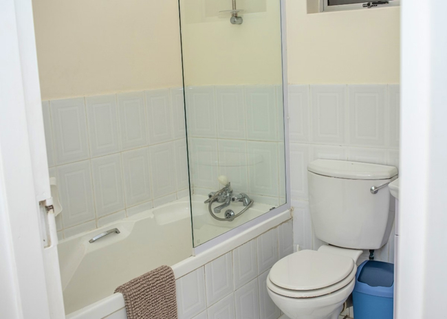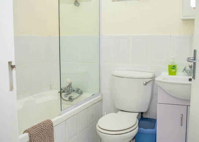 The main bedroom is furnished with a queen-size bed and includes an en-suite bathroom equipped with a shower, basin, and toilet. The second bedroom, with a double bed, utilizes the guest bathroom, which features a bath with a hand-held shower, basin, and toilet. All linens and towels are provided.