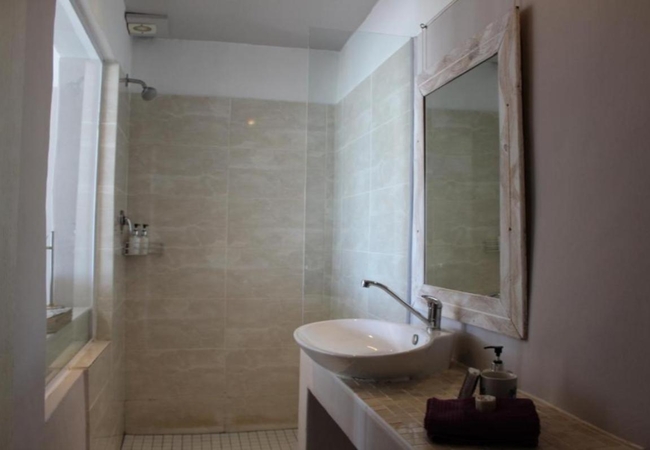 This luxurious room is furnished with a king-size bed and an en-suite bathroom fitted with a shower, toilet and basin. The room opens to a patio with outdoor furniture and stunning sea views. The patio leads to the garden.