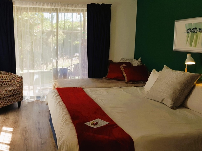 The Queen Room is an intimate and comfortable room that leads out onto the communal pool area. The room is furnished with an en-suite bathroom fitted with a shower, toilet and basin. Other facilities include TV with DStv, free Wi-Fi, a desk with chair and tea and coffee making facilities.