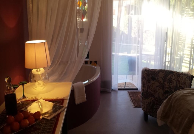 This room sleeps two guests in a King-size bed. Enjoy your own private en-suite bathroom (shower) and in-room romantic bath. Open your doors onto the garden, where you can relax in the sun or take a refreshing soak in the pool. The warm plum colour of this room envelops you in its comforting aura.